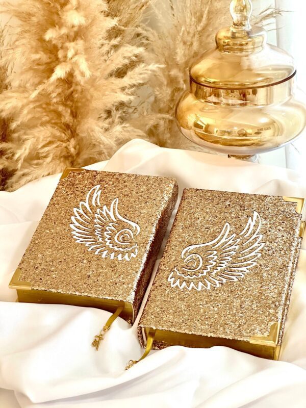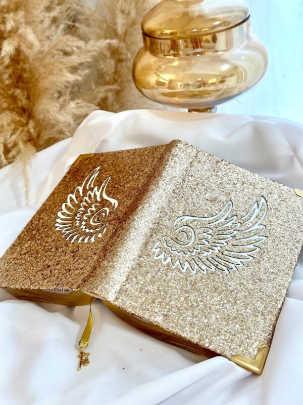 Produzida com desenho vazado no gliter, cantoneiras douradas e fita de cetim que acompanha um lindo pingente fé.