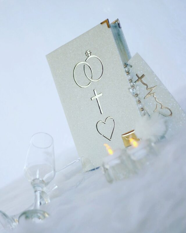 Produzida com gliter, cantoneiras douradas e fita de cetim que acompanha um lindo pingente fé.