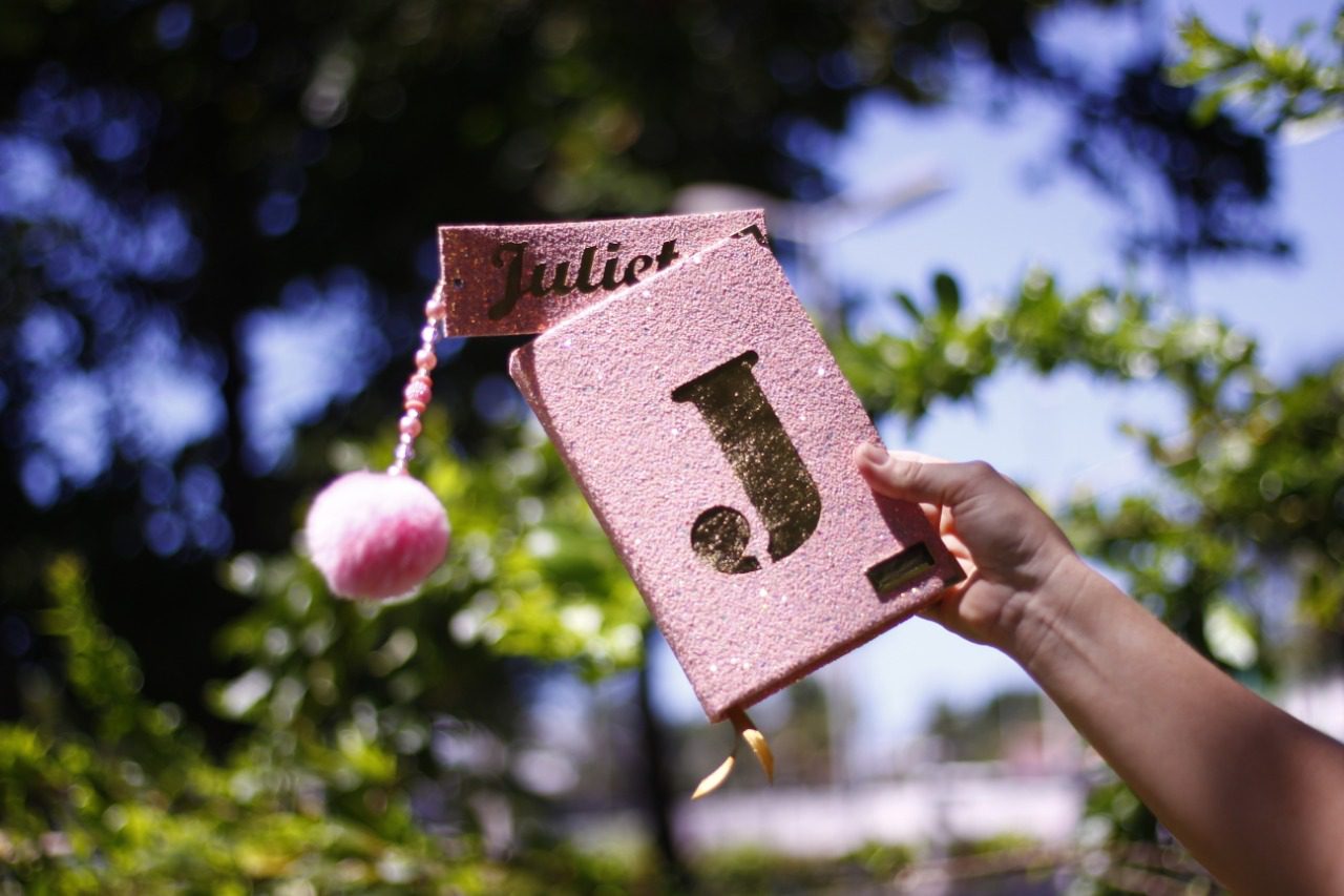 Produzida no gliter e com cantoneiras douradas e fita de cetim com pingente fé.