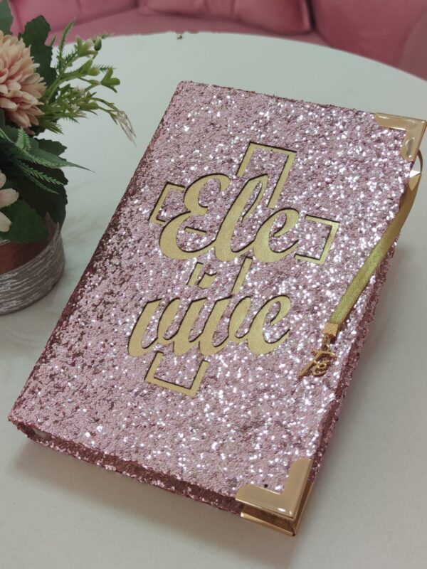 Produzida com desenho vazado no gliter, cantoneiras douradas, fita de cetim que acompanha um lindo pingente fé e plaquinha personalizada com seu nome.
