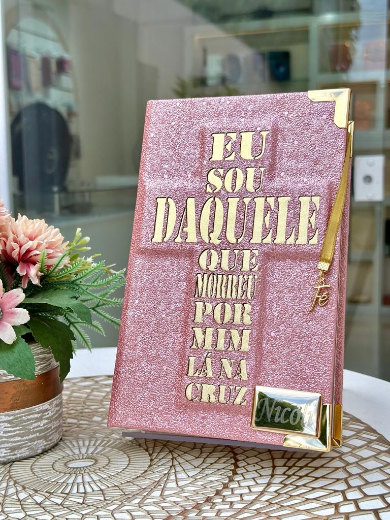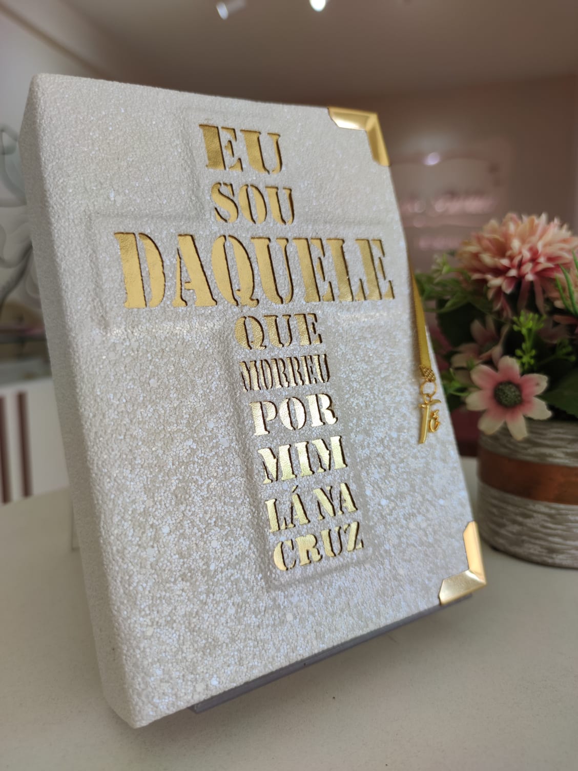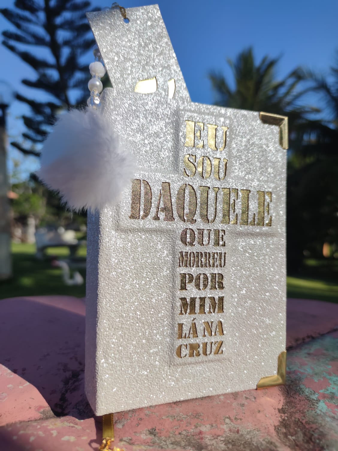 Bíblia eu sou daquele que morreu por mim lá na cruz, com cruz em alto relevo no gliter sintético.