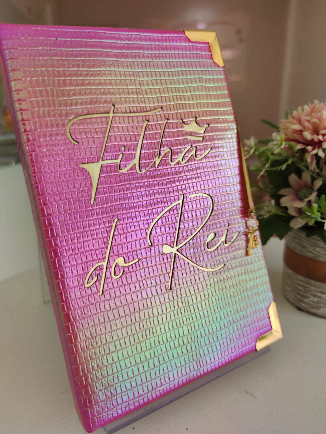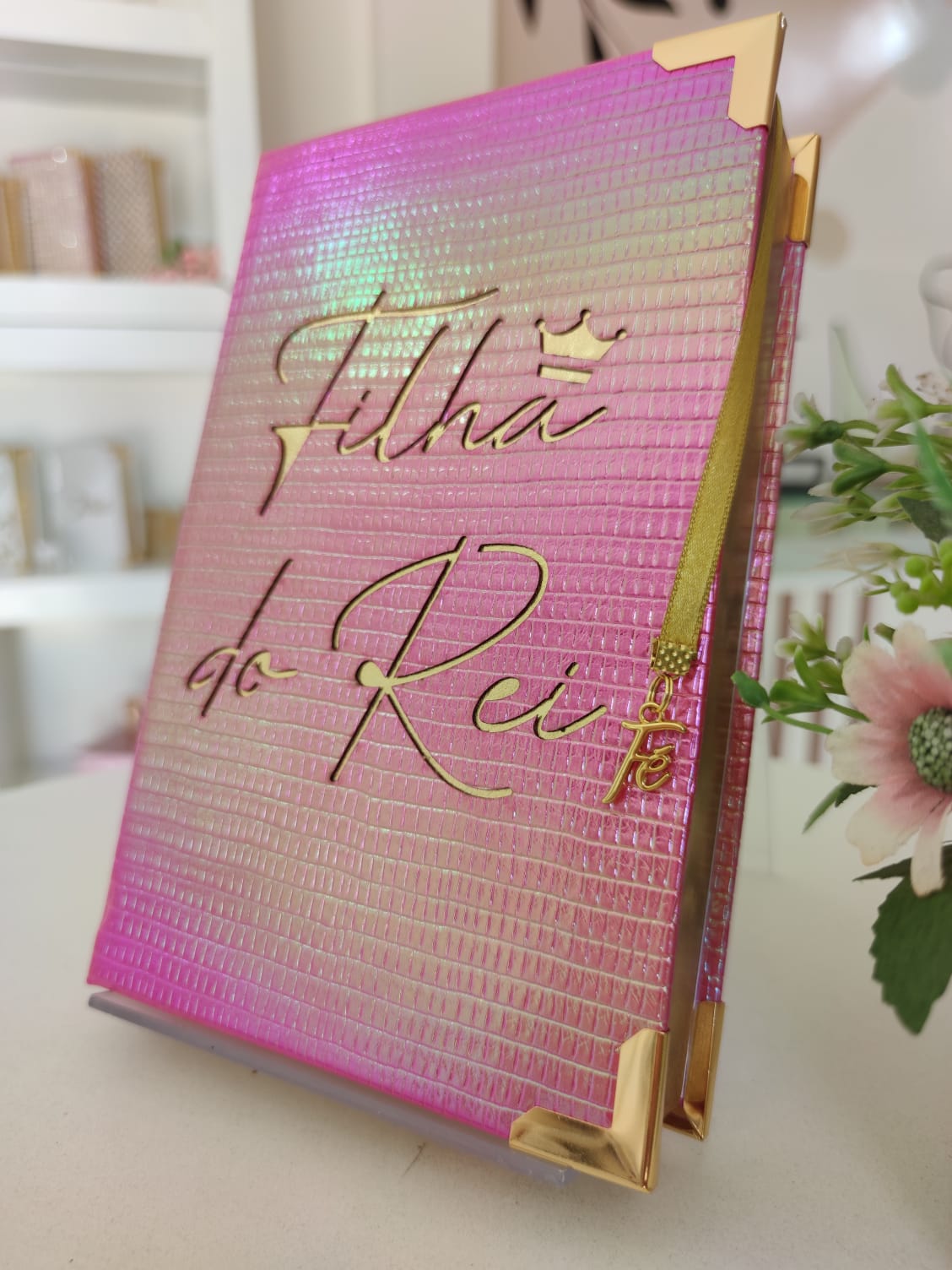 Produzida com desenho vazado no couro sintético texturizado e holográfico que reflete outras cores em exposição a luz, cantoneiras douradas e fita de cetim com pingente fé.