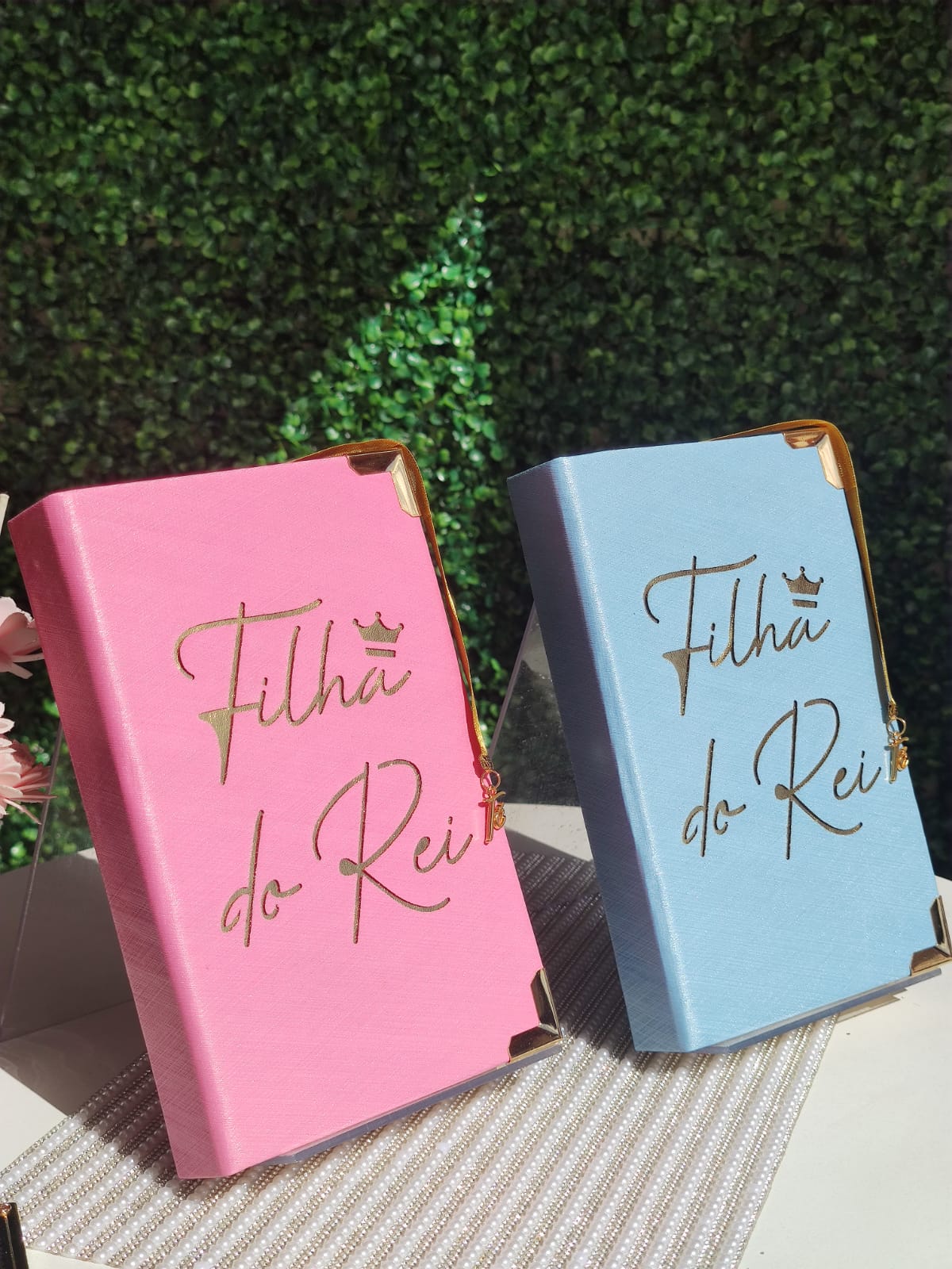 Desenho vazado no tecido sintético, cantoneiras douradas e fita de cetim que acompanha um lindo pingente fé.
