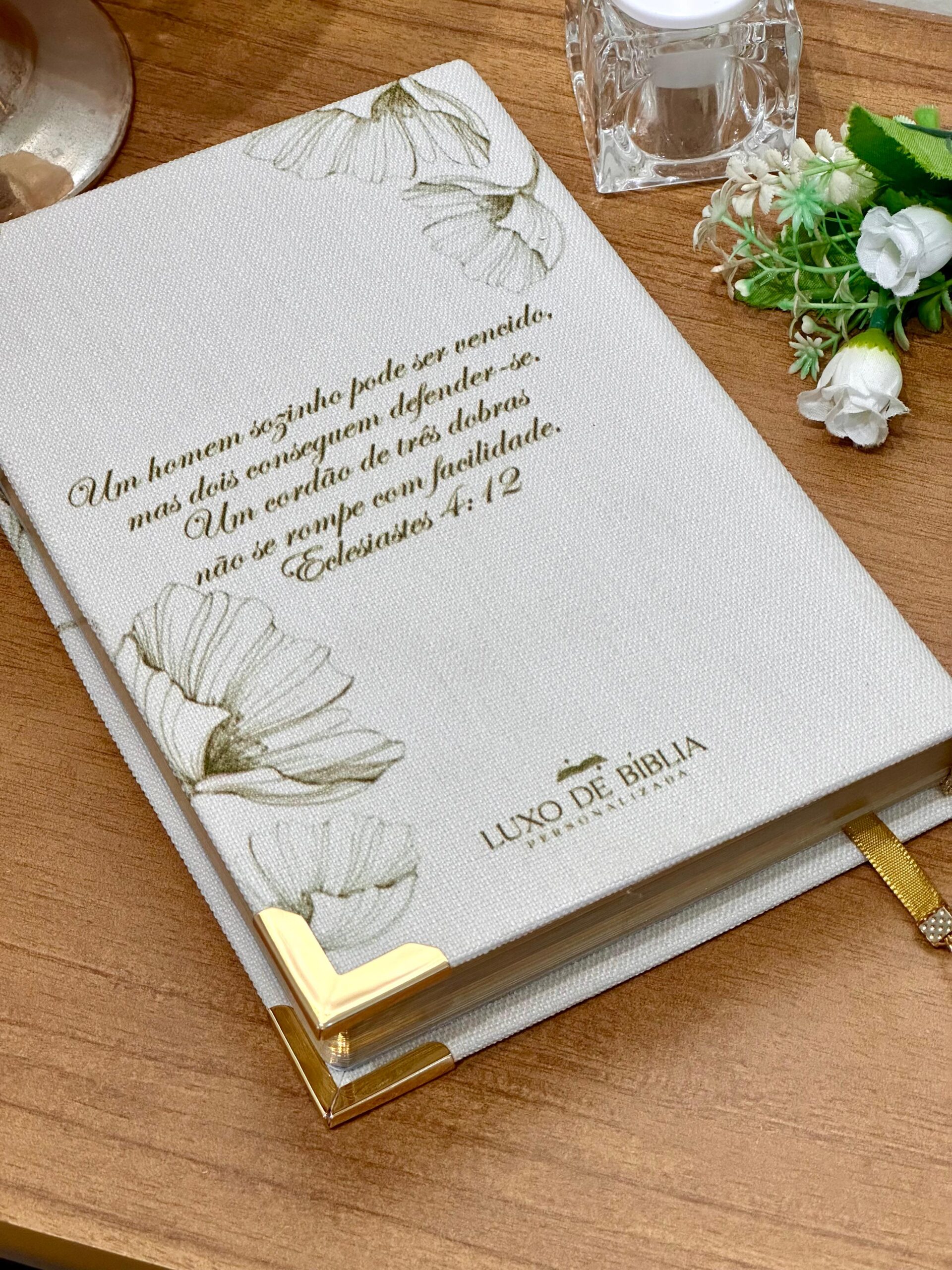 A Bíblia em Linho Luxo de Bíblia foi criada para quem deseja unir elegância, durabilidade e significado espiritual em uma única peça. Produzida com capa em linho texturizado de alta qualidade, ela recebe cantoneiras metálicas dourados que trazem um toque sofisticado e atemporal.