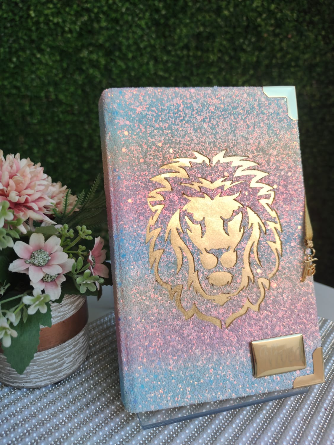 Desenho vazado no gliter collor, cantoneiras douradas e fita de cetim que acompanha um lindo pingente fé.