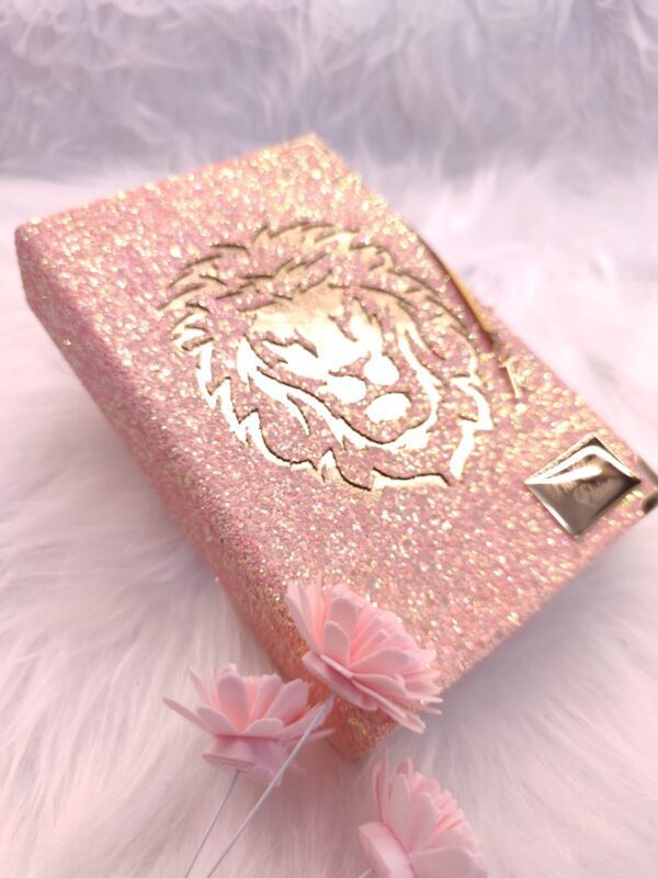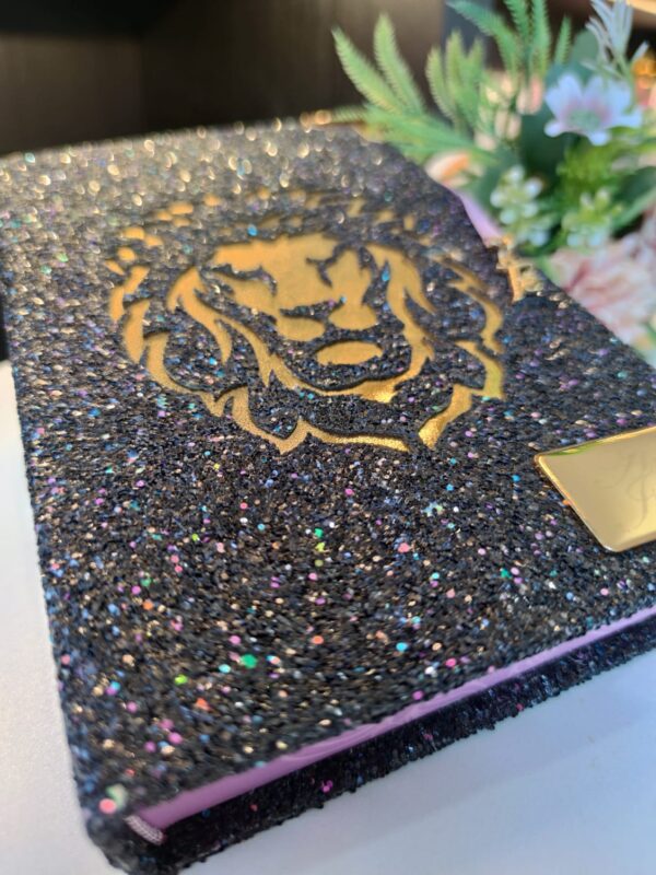 Produzida com gliter, cantoneiras douradas e fita de cetim que acompanha um lindo pingente fé.