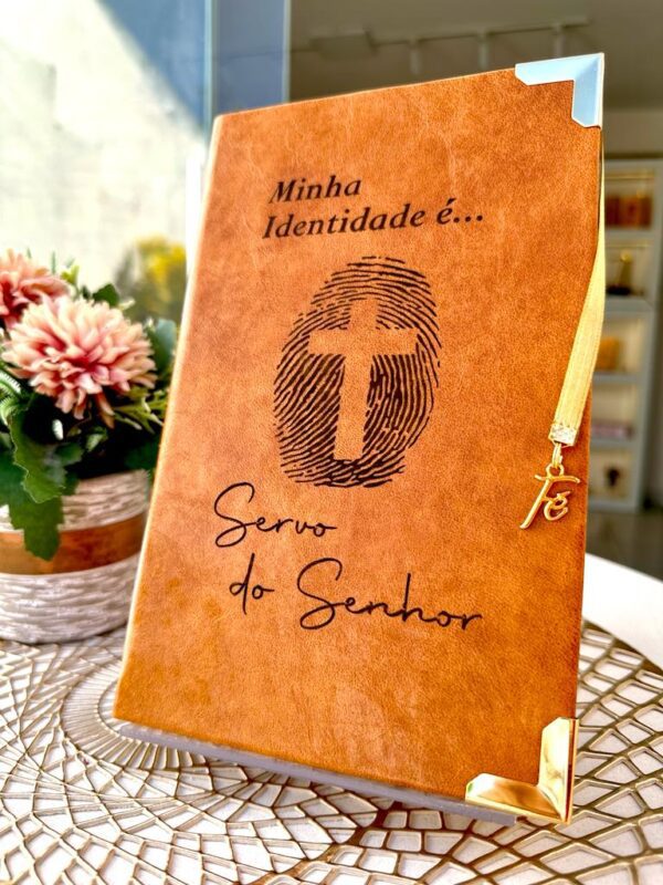 Produzida com desenho gravado no couro sintético liso, cantoneiras douradas e fita de cetim com pingente fé.
