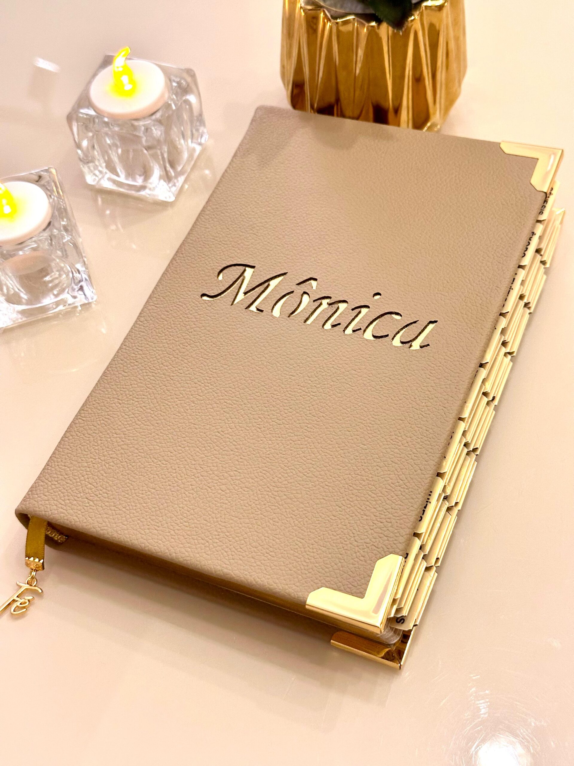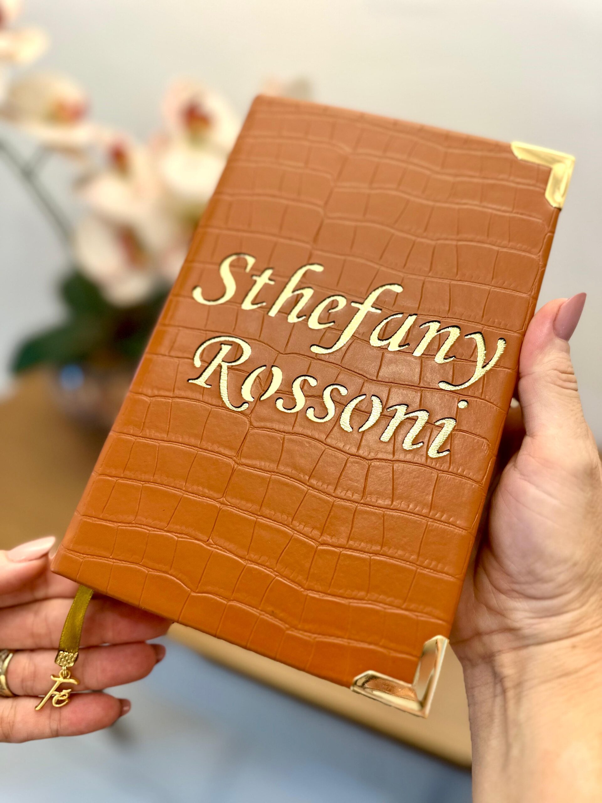 Produzida com courino, cantoneiras douradas e fita de cetim que acompanha um lindo pingente fé.