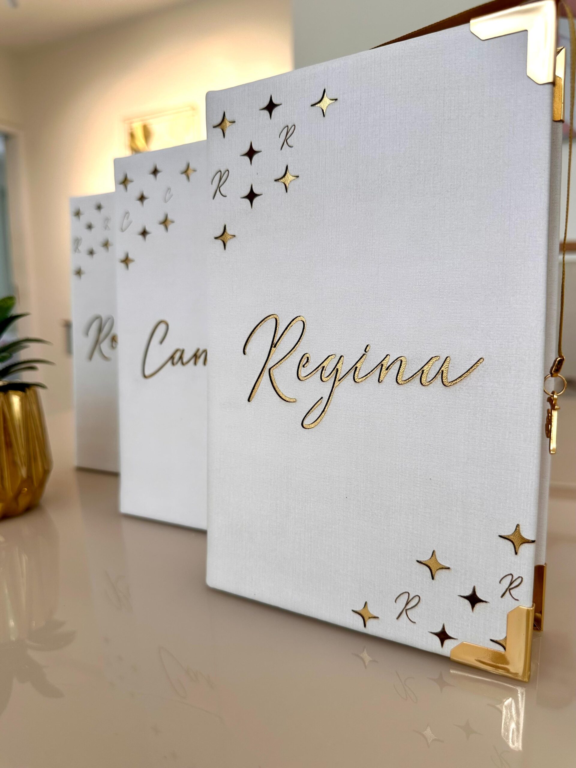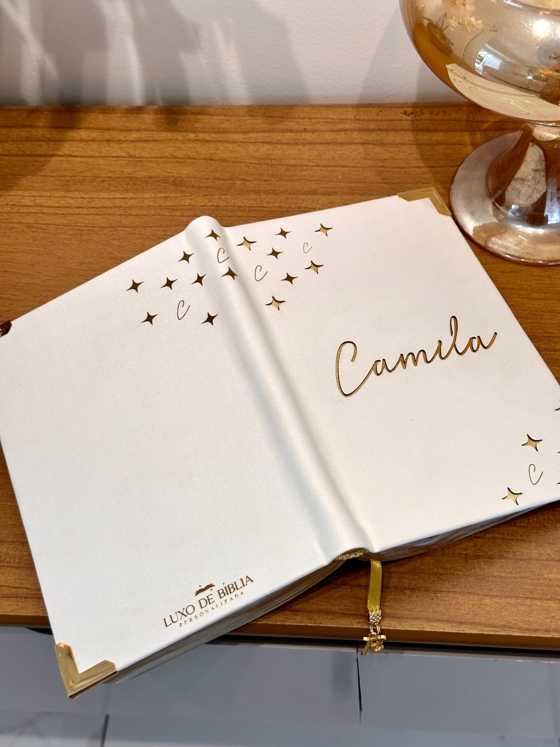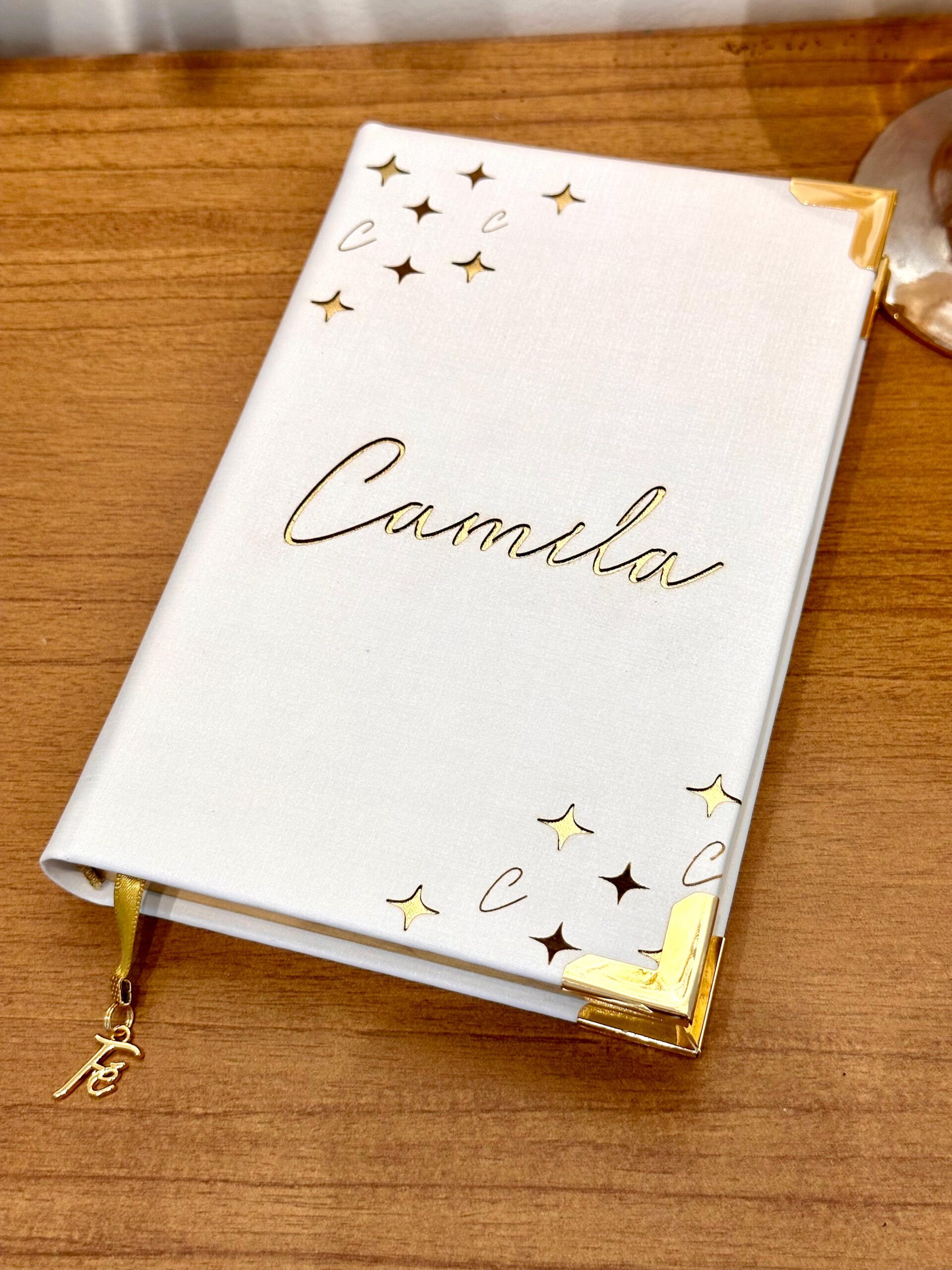 Bíblia personalizada com seu nome minimalista e brilhos no tecido .