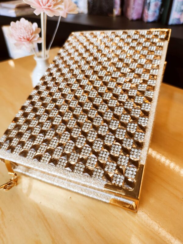 Produzida com pedrarias xadrez e strass, debrum de tecido com gliter, acabamento com cantoneiras dourada ou prata, fita com pingente fé.