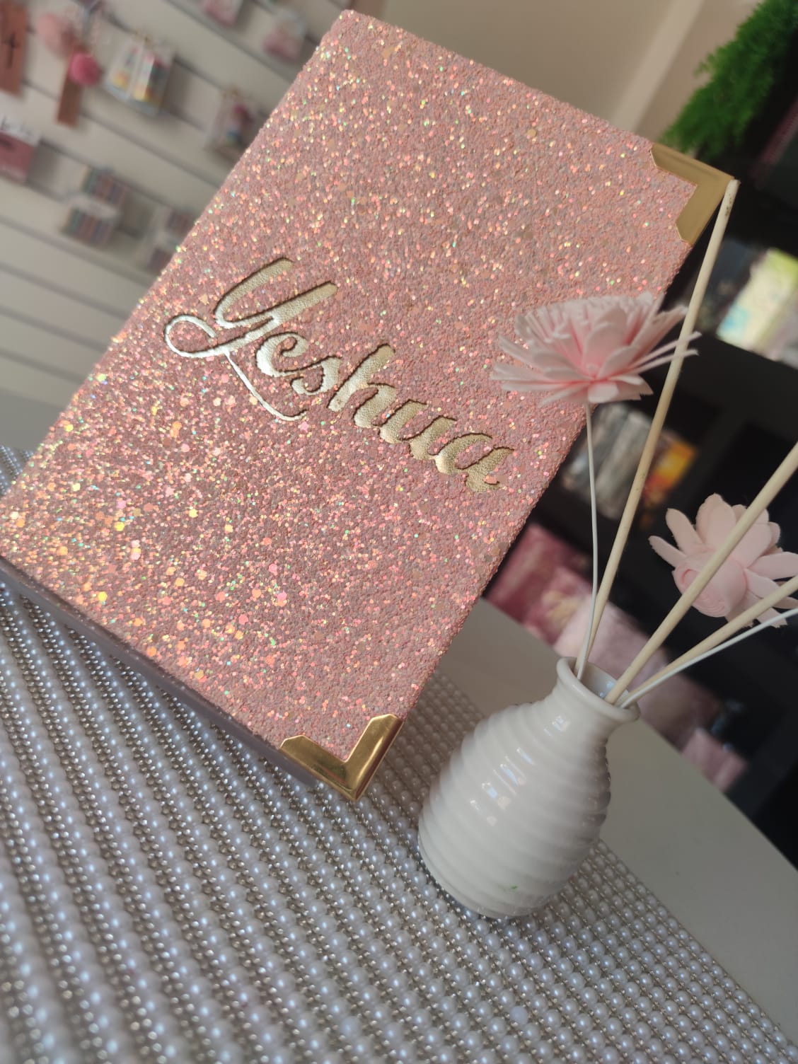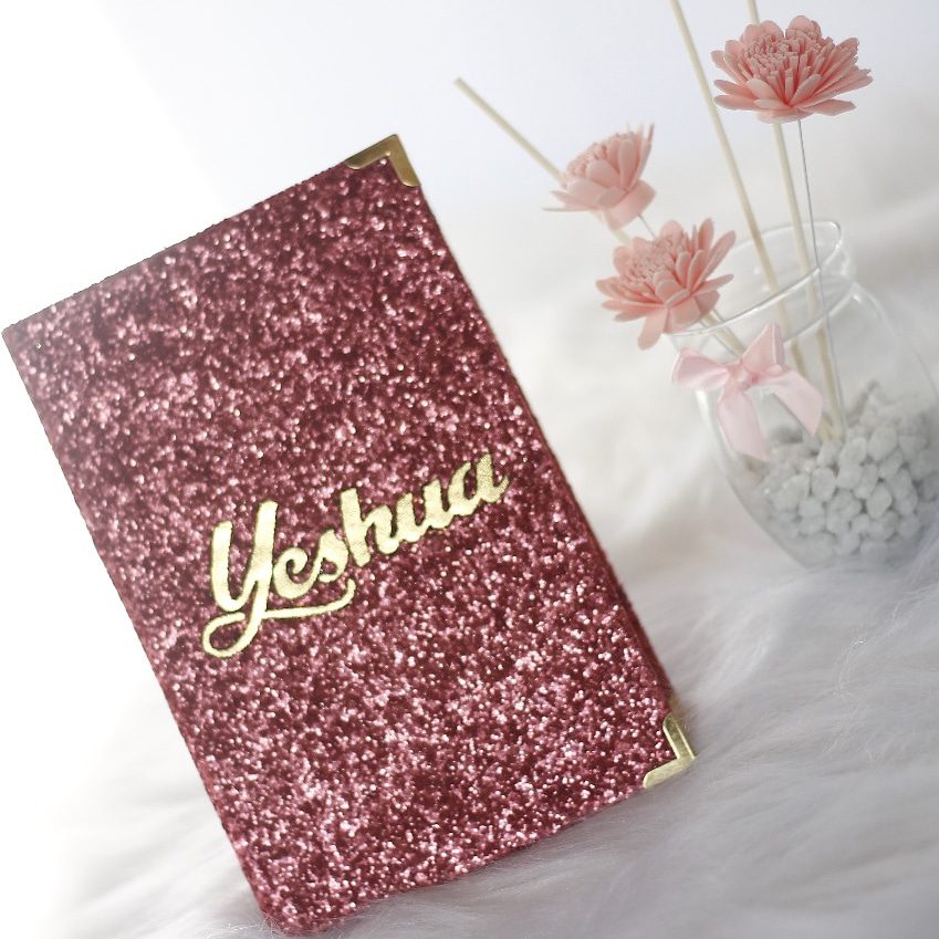 Produzida com nome Yeshua vazado no gliter, cantoneiras douradas e fita de cetim que acompanha um lindo pingente fé.