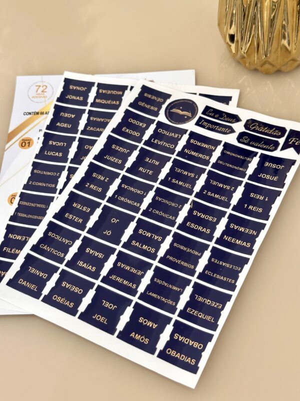 São 66 livros, de Gênesis a Apocalipse e também contêm 6 adesivos decorativos .