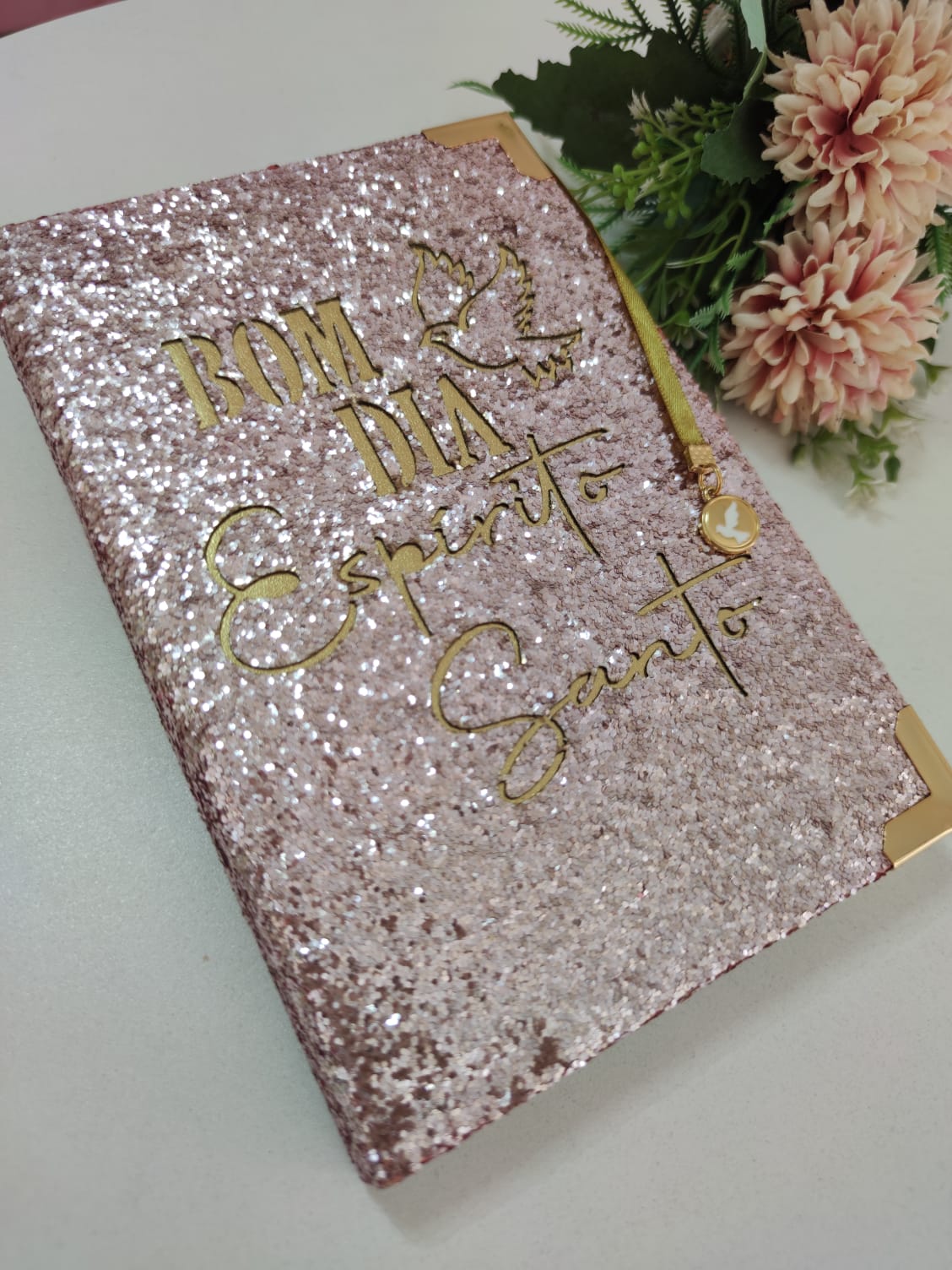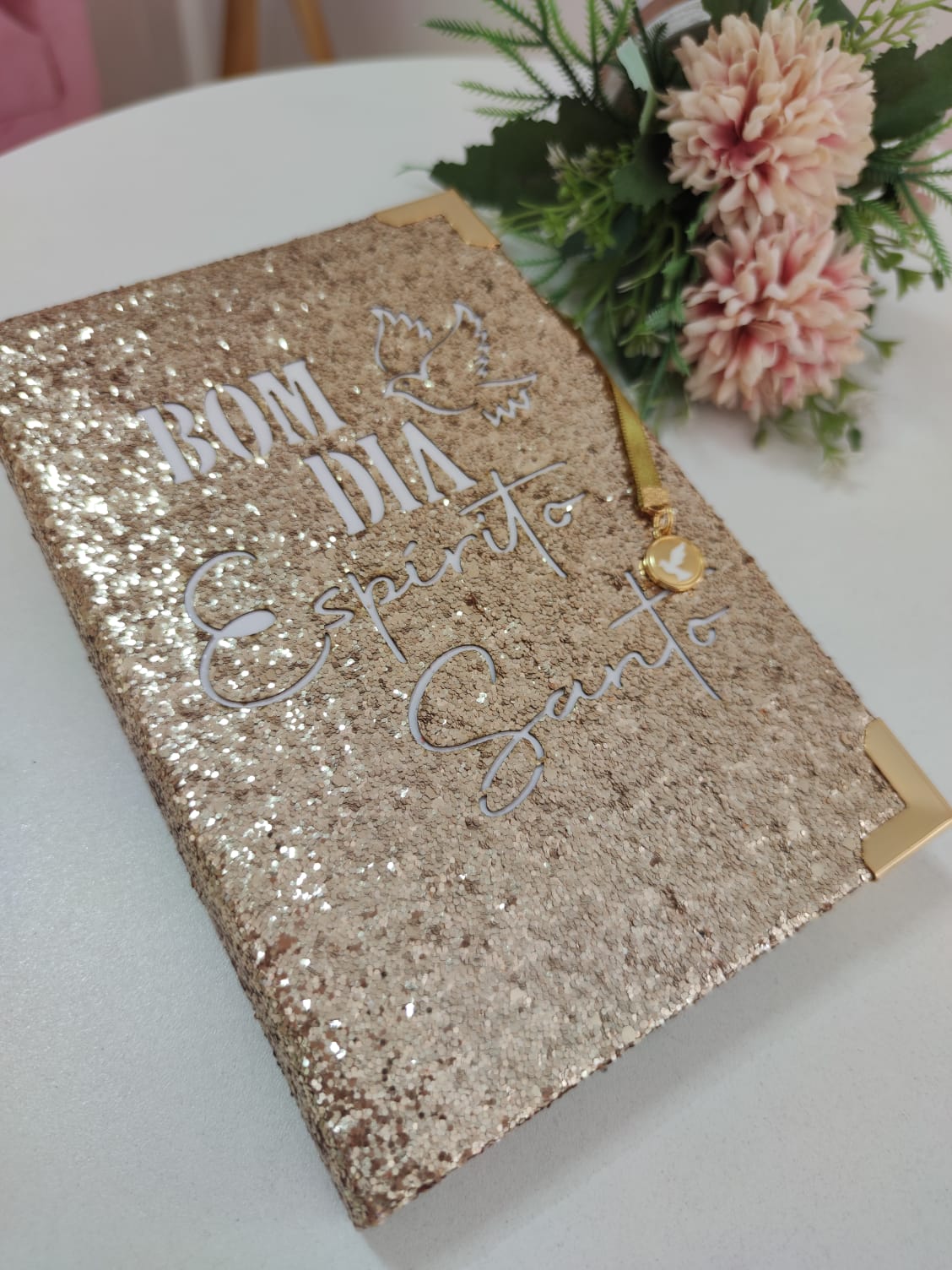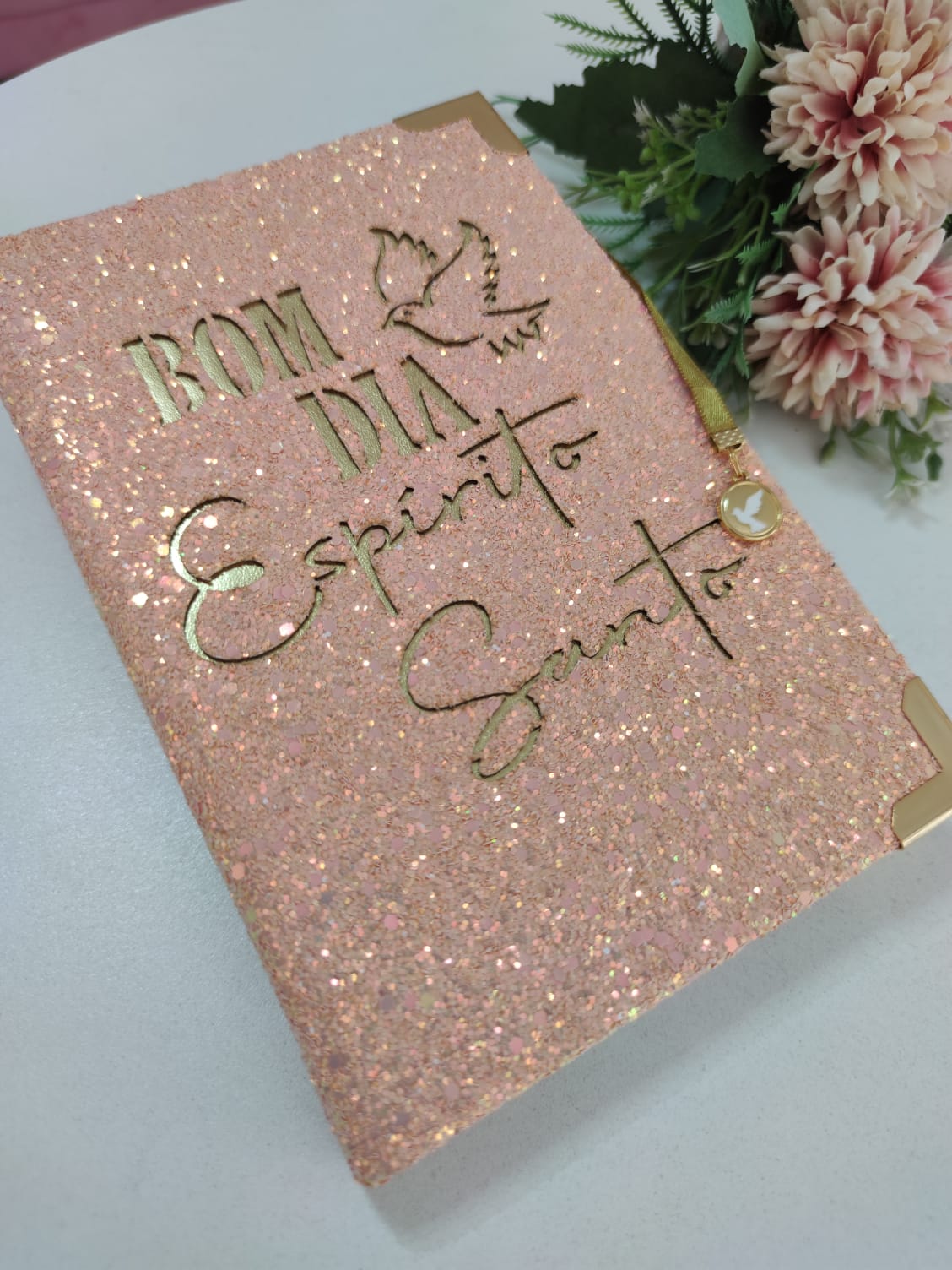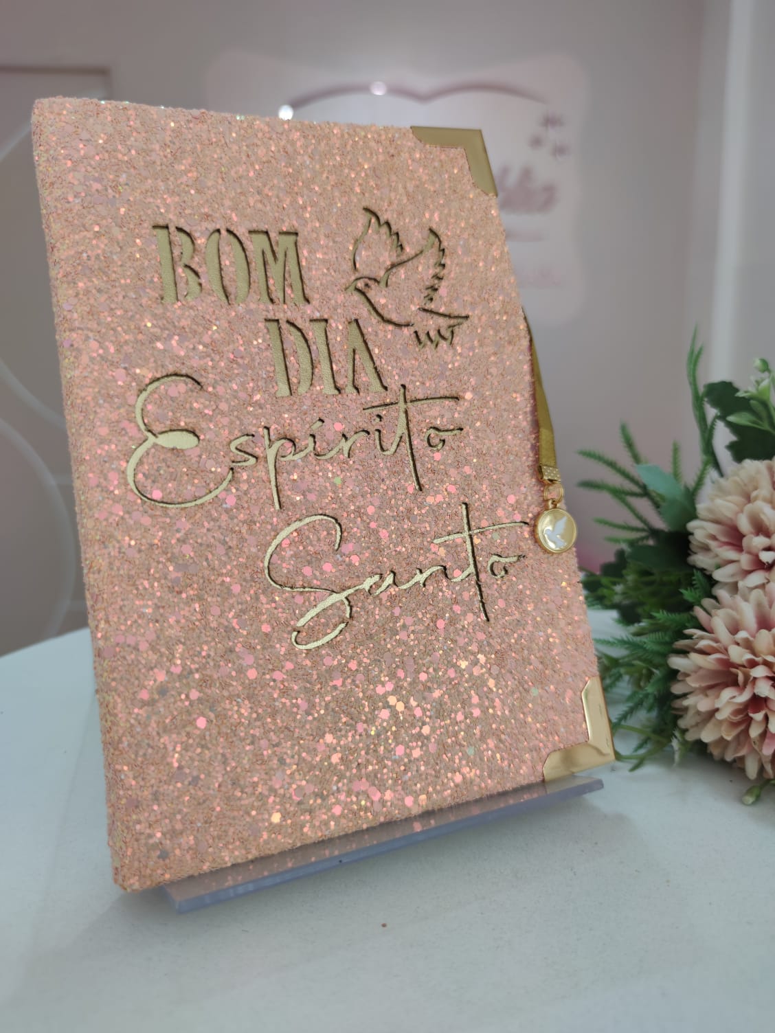 Produzido no gliter com desenho vazado, cantoneiras e fita de cetim com lindo pingente da pomba da paz.
