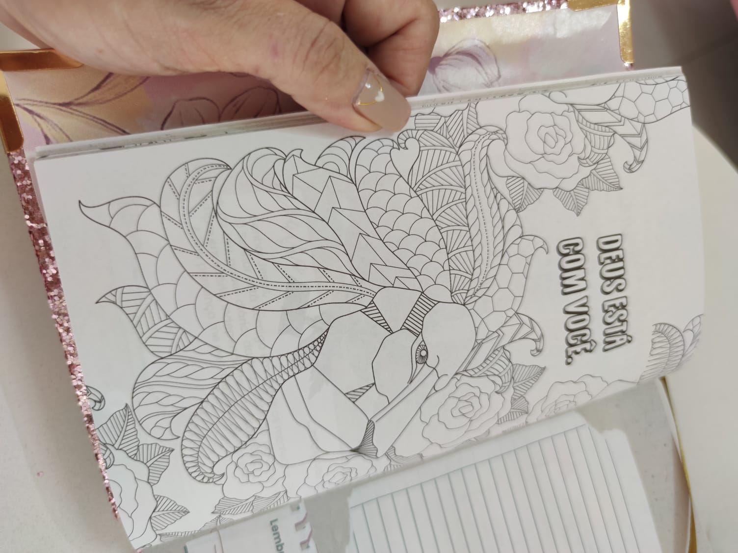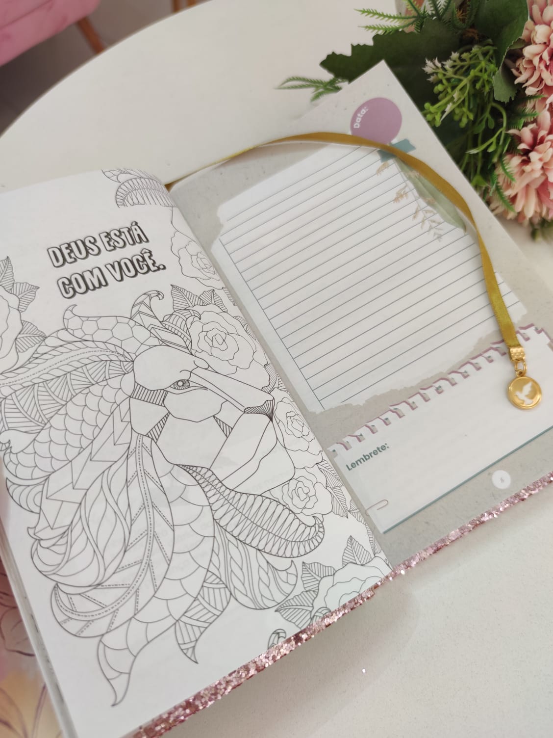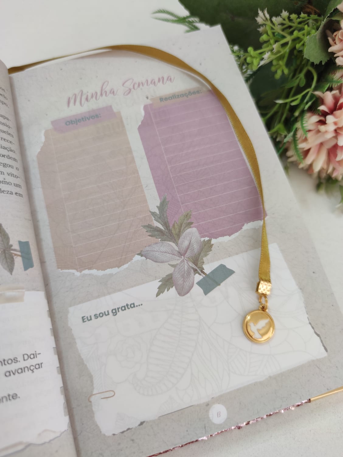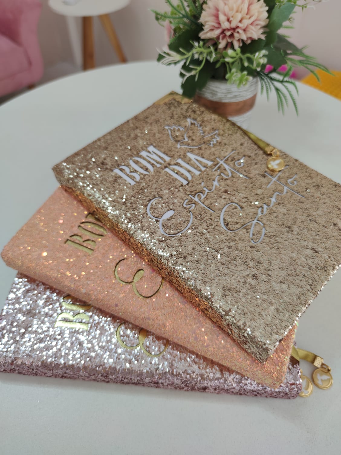 Produzido no gliter com desenho vazado, cantoneiras e fita de cetim com lindo pingente da pomba da paz.